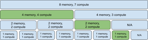 이 그림이 실제로 GPU Instance가 GPU 상에서 생성되면 물리적으로 해당 Instance 가 어디에서 존재하게 되는지를 보여주는 그림이다. 실제 하나의 GPU Instance의 물리적 위치는 다른 GPU Instance들이 초기화될 수 있도록 제 역할을 수행할 것이며, 이를 위해서 분할이 발생할 수 있다.