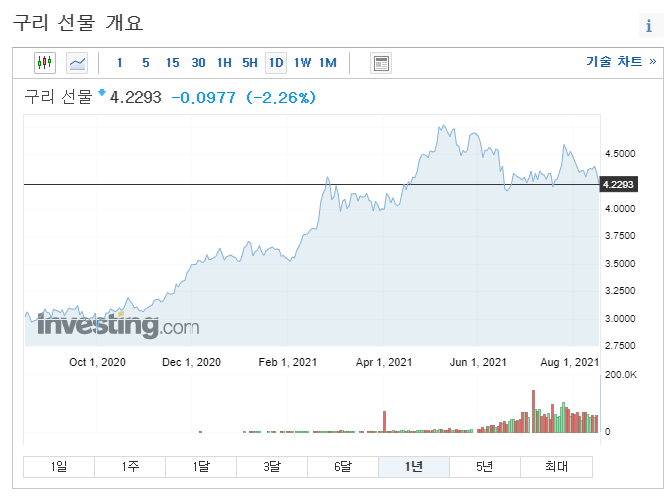 구리도 뭐.. 1.5배 정도? 가격상승을 보여준다.