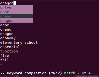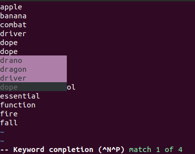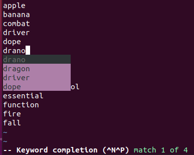 > ctrl + n : 현재 위치 다음에 위치한 키워드를 기반으로 단어를 완성한다.