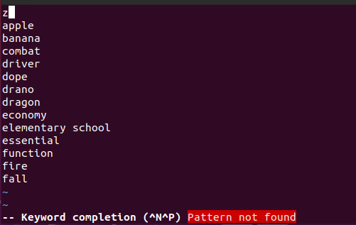 1. 아래와 같이 파일에 키워드를 넣어두고 z 를 입력했다. 그리고 insert mode로 변경하기 위해 'i'를 누른 뒤 ctrl + n / p를 시도했지만 Pattern을 찾지 못한다.