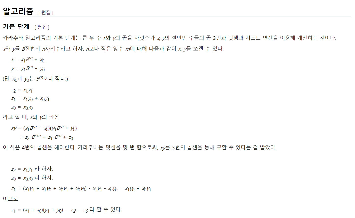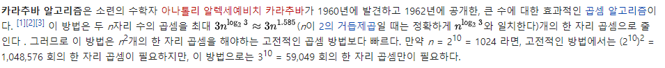 큰 수를 곱해야 하는 상황에서 카라추바 알고리즘이 최적화에 많이 이용 된다고 하여...