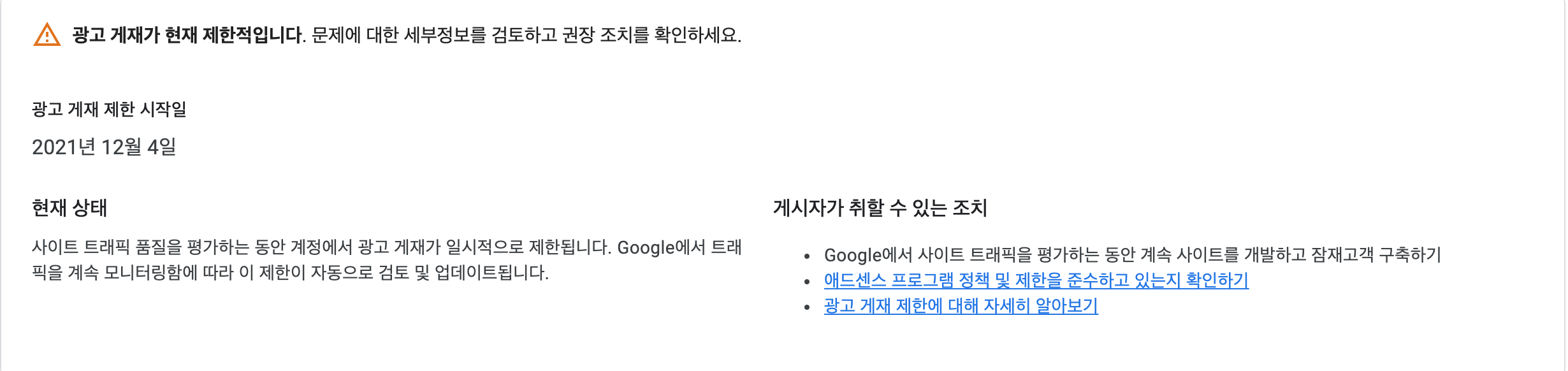 "사이트 트래픽 품질을 평가하는 동안 계정에서 광고 게재가 일시적으로 제한됩니다. Google에서 트래픽을 계속 모니터링함에 따라 이 제한이 자동으로 검토 및 업데이트됩니다."