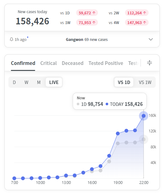 저번 주 부터 코로나 확진자가 정말 눈에띄게 증가했는데.. 오늘은 15만명을 넘어버리는 충격적인 숫자를 보게 되었습니다..