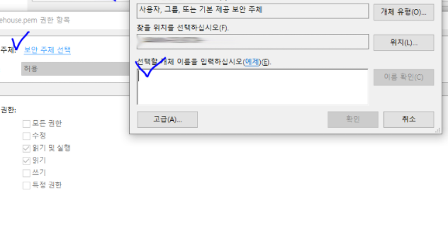 선택할 개체 이름을 입력하십시오 라는 공간에 현재 윈도우 로그인 계정을 입력 해 줍니다.