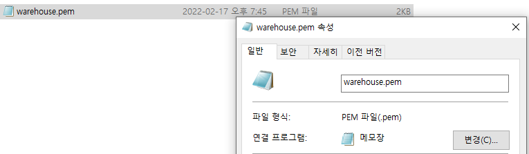 이제 .pem 파일 속성도 확인해 줍니다.