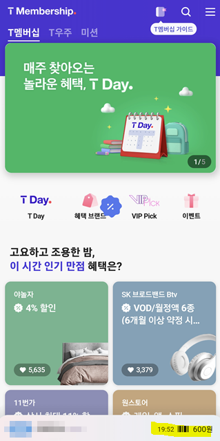 T 멤버십 앱은 예전부터 설치되어 있어서 바로 실행을 했어요.