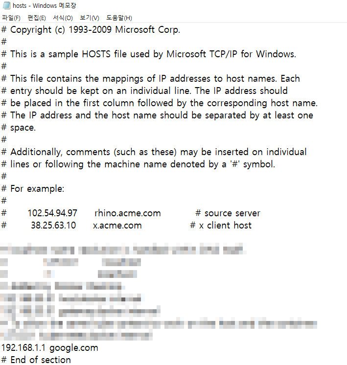 아래 예시에서는 192.168.1.1 라는 말도 안되는 IP를 google.com 과 매핑시켰습니다.