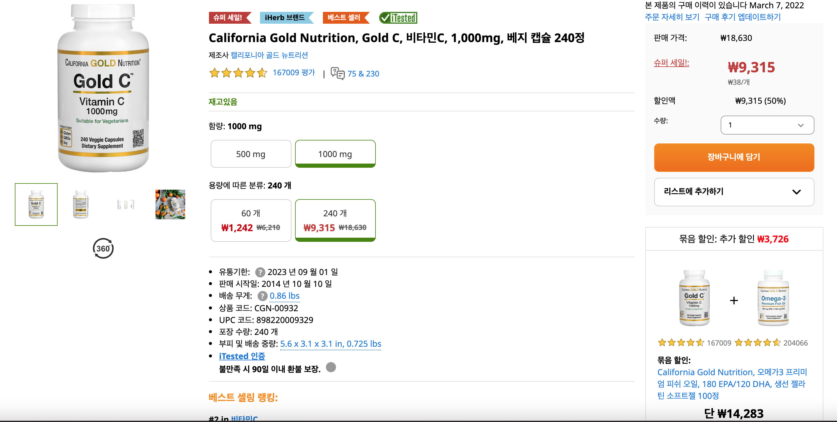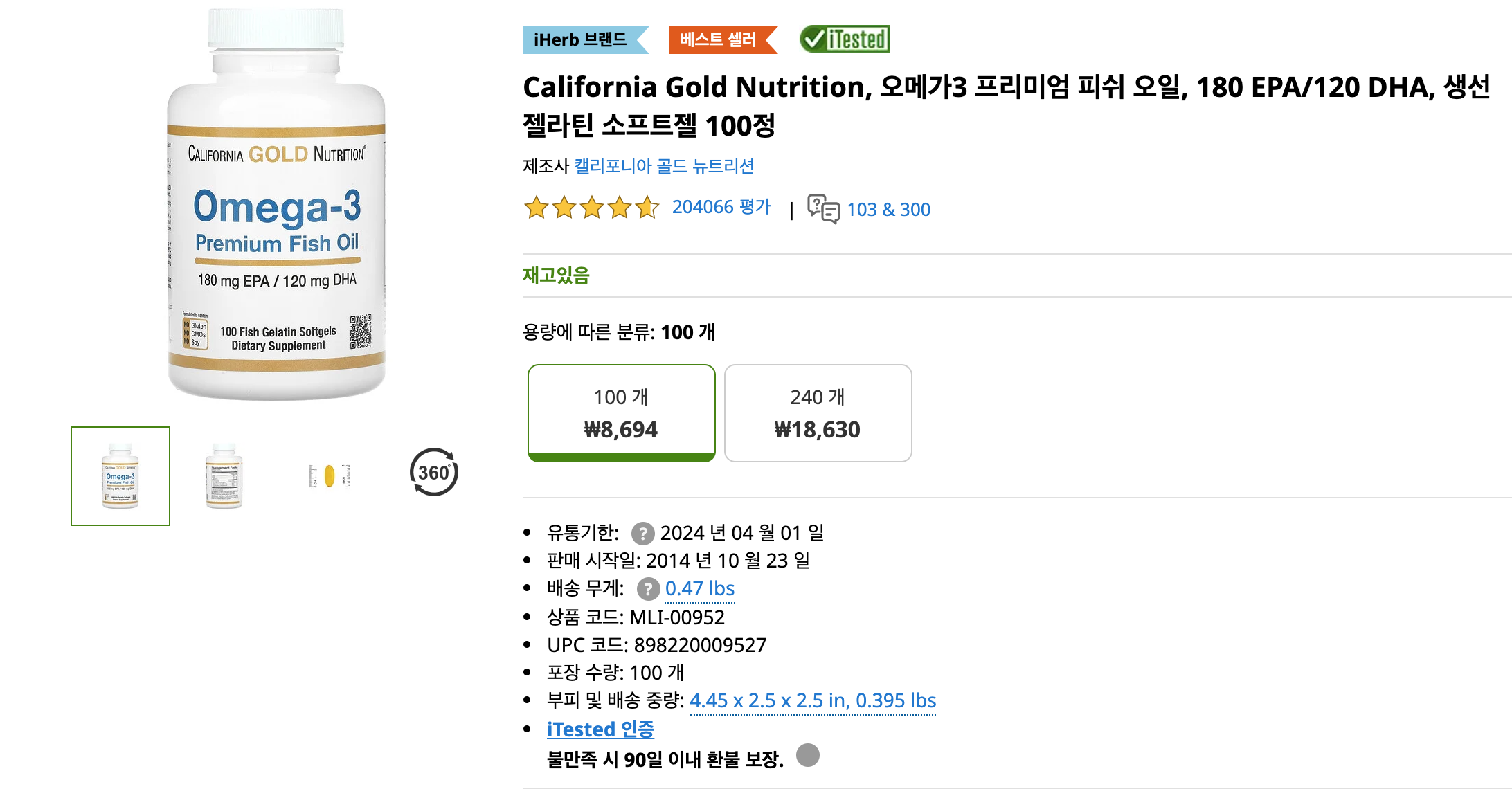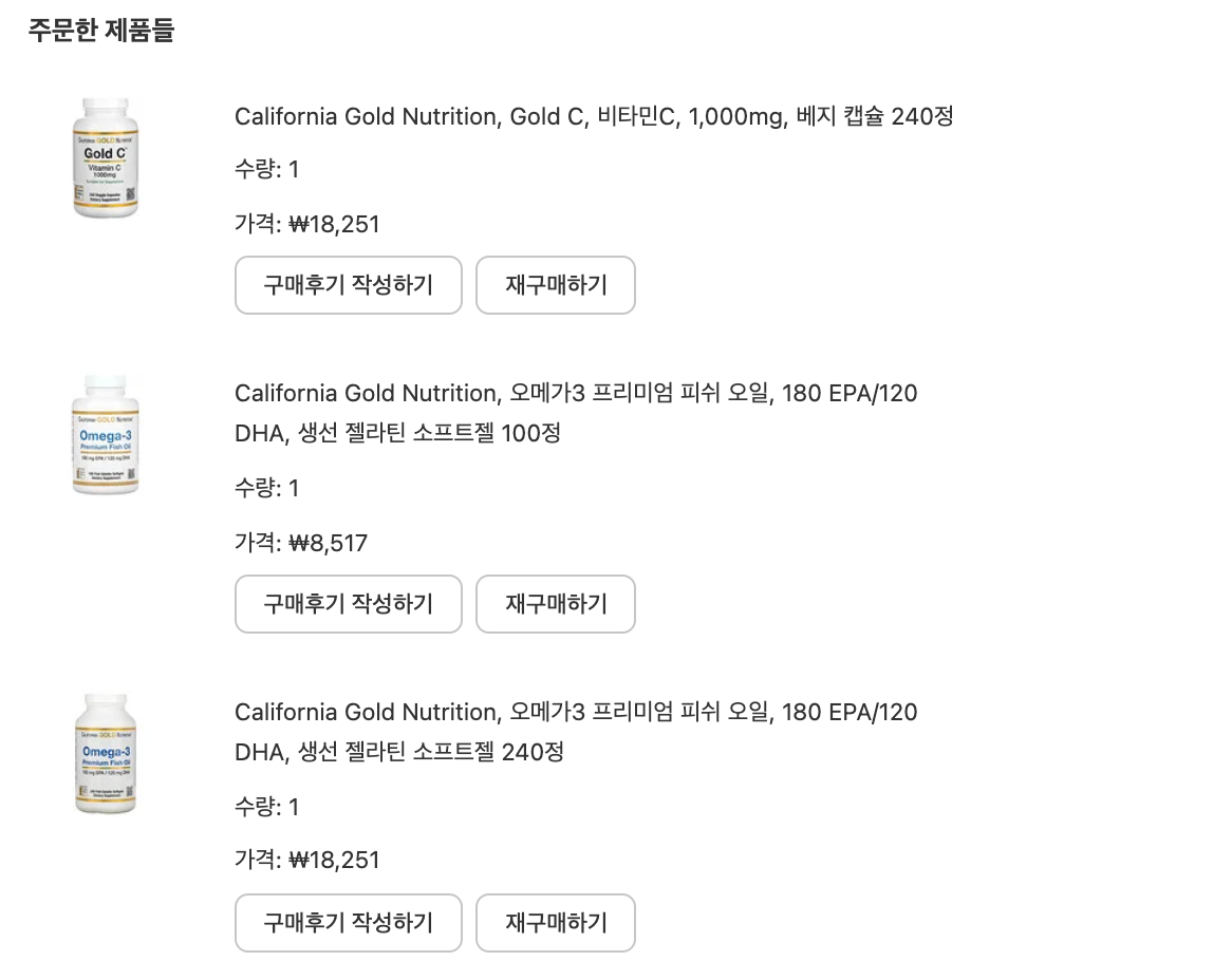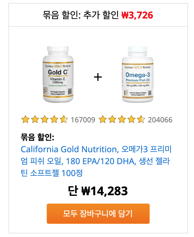 저는 3가지 제품을 주문했는데, 오메가 3는 동일한 제품으로 100정, 240 정 2개를 구매했구요, 비타민c 는 240정 짜리 제품을 구매했습니다.