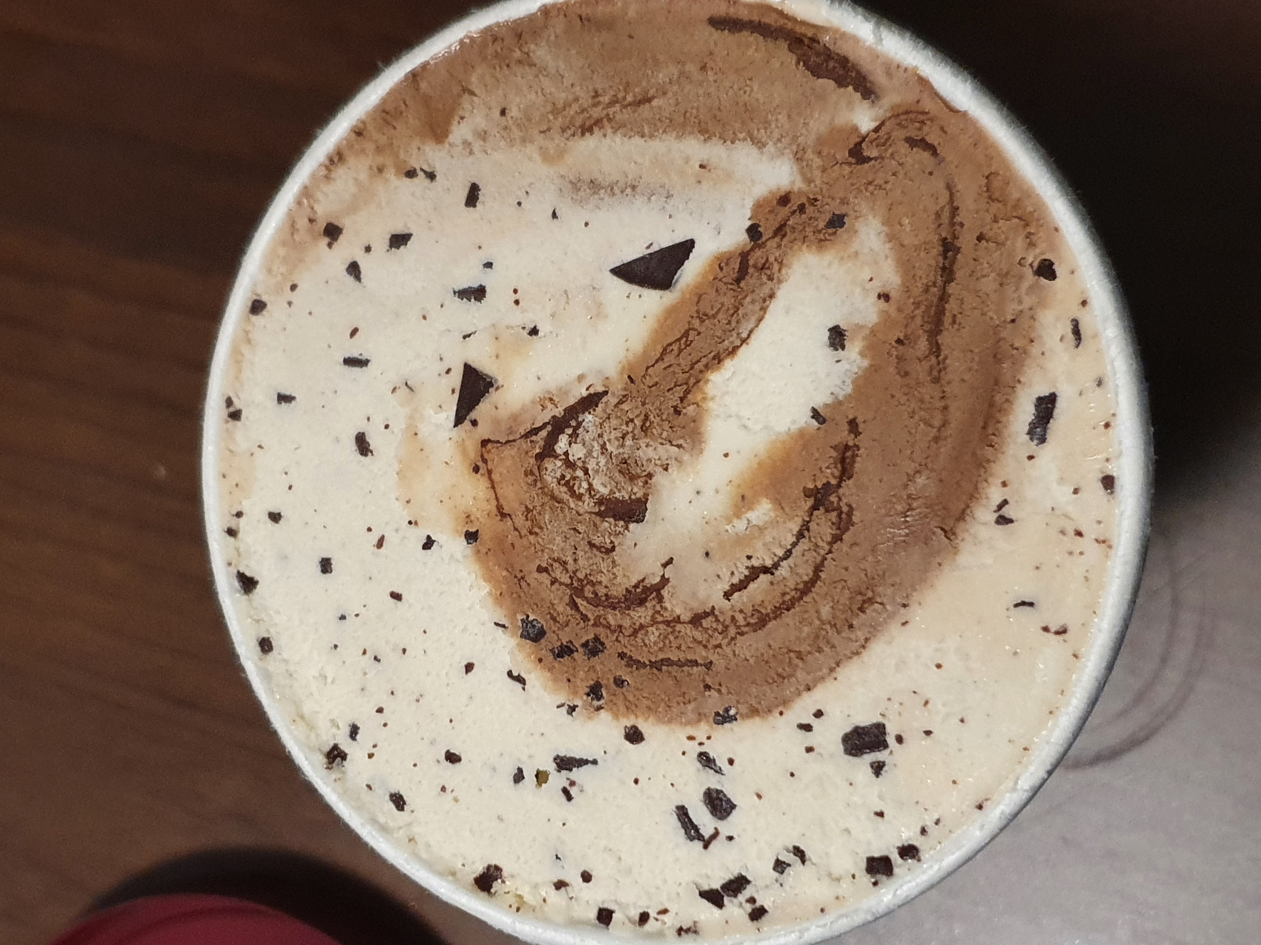 바닐라와 초코 아이스크림이 섞여있고 초콜렛칩이 여기저기 흩뿌려져 있다.