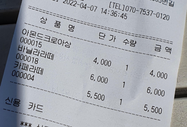 우리는 아몬드크로아상, 바닐라라떼, 카페라떼를 주문했다.