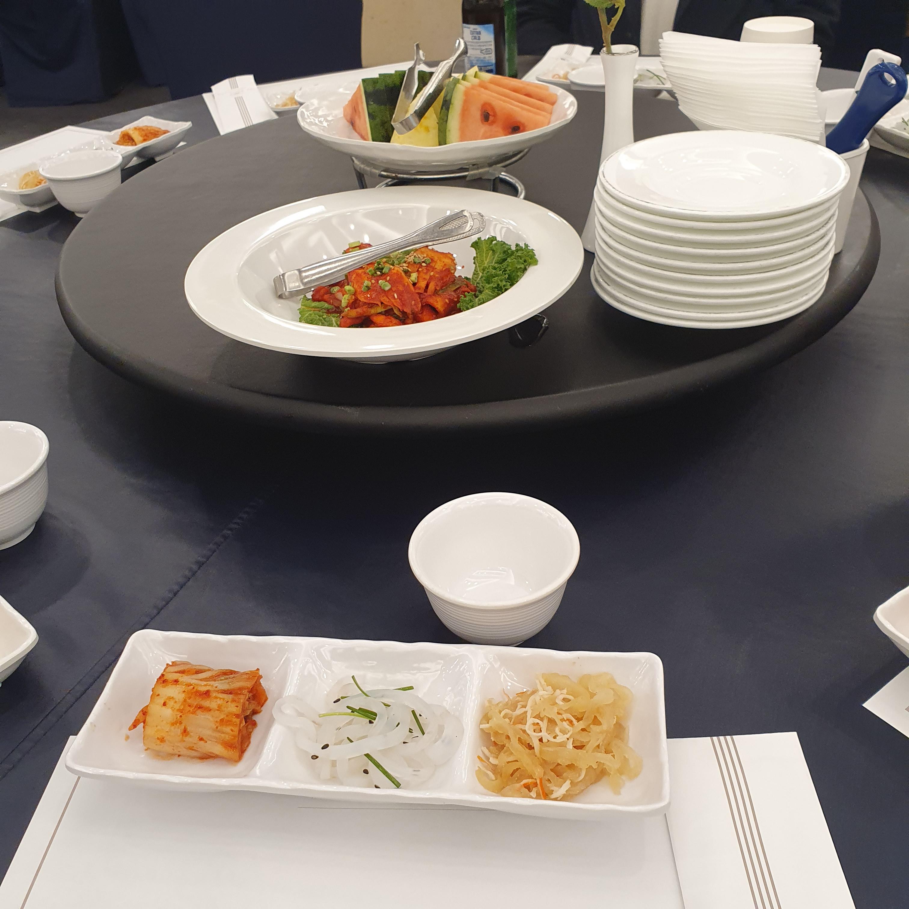 중간 원판 테이블에 갈비, 육회, 깐쇼새우 같은것들이 올라간다.