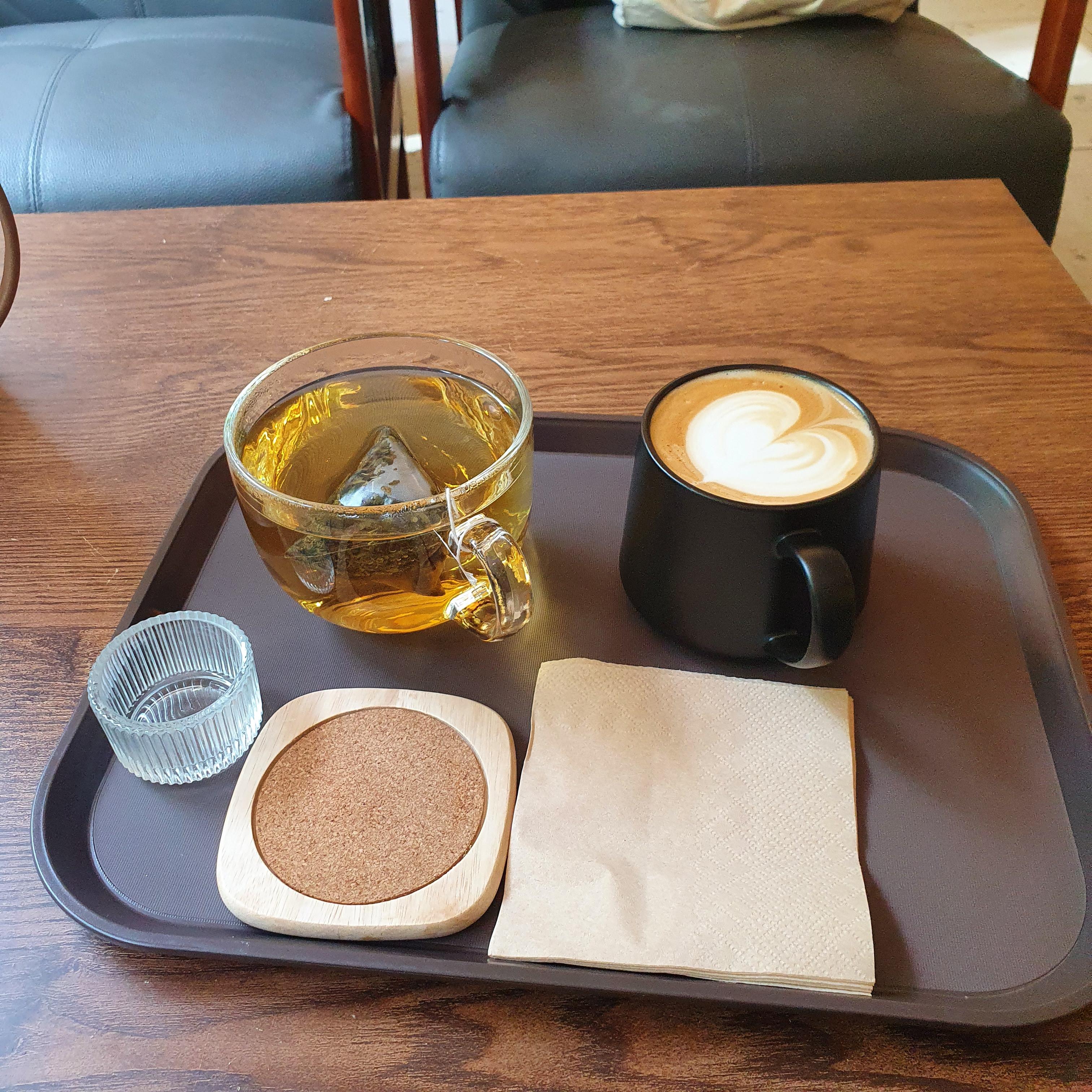 우리는 카페라떼와 페퍼민트 차를 주문했다.