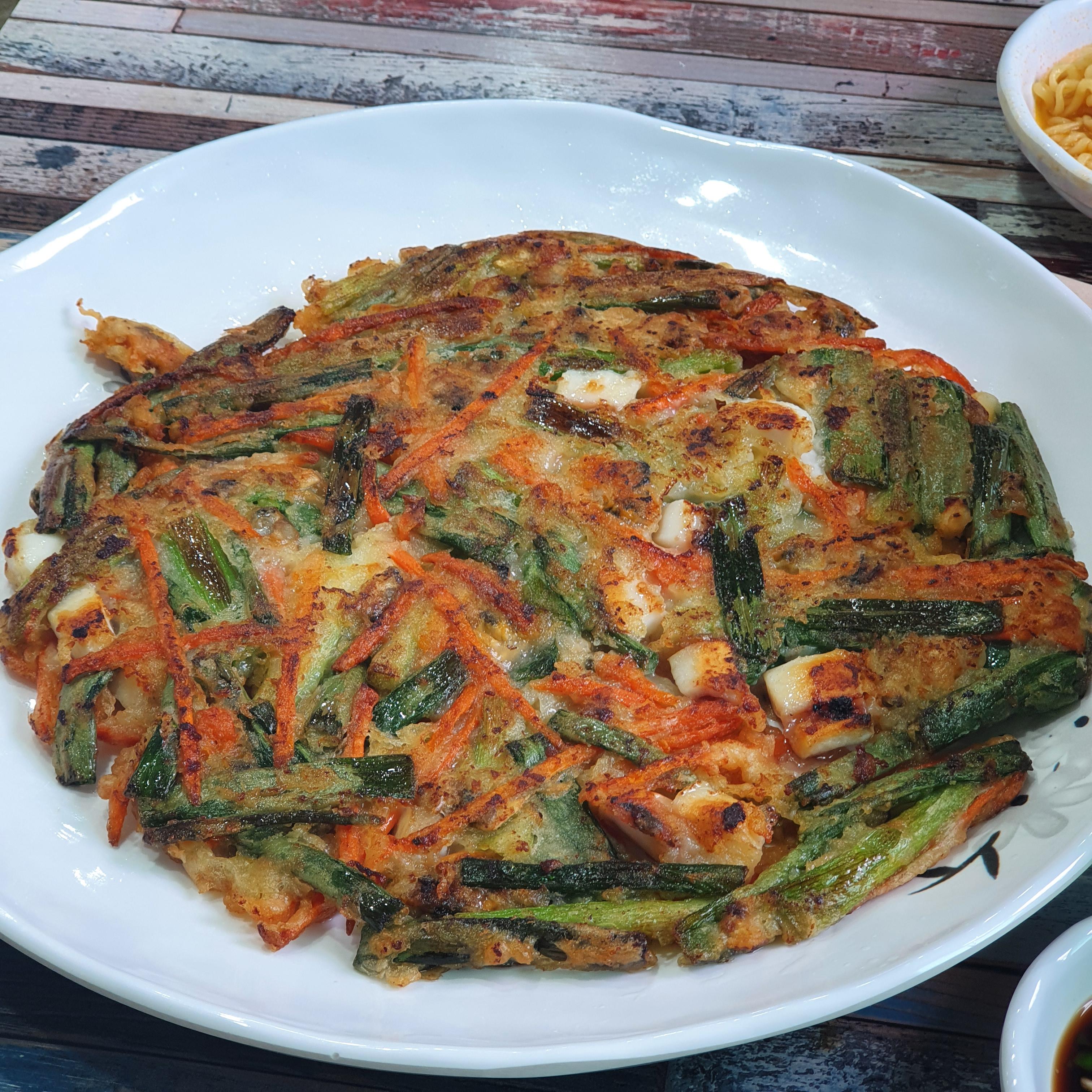 우리는 해물파전과 배말라면을 주문했다.