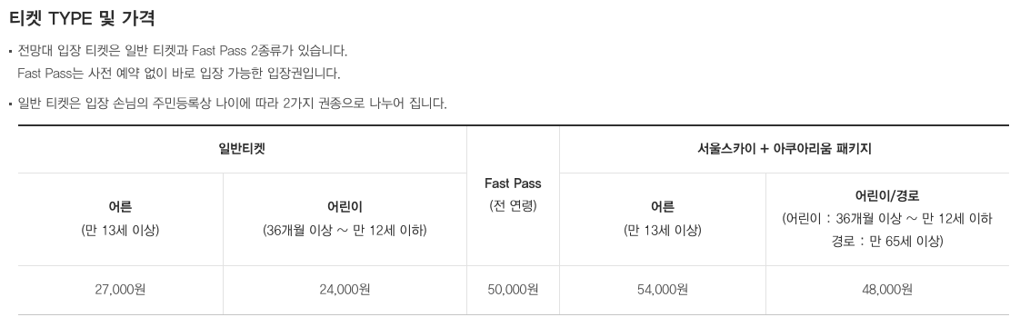 서울 스카이는 티켓 타입이 조금 다양한데요