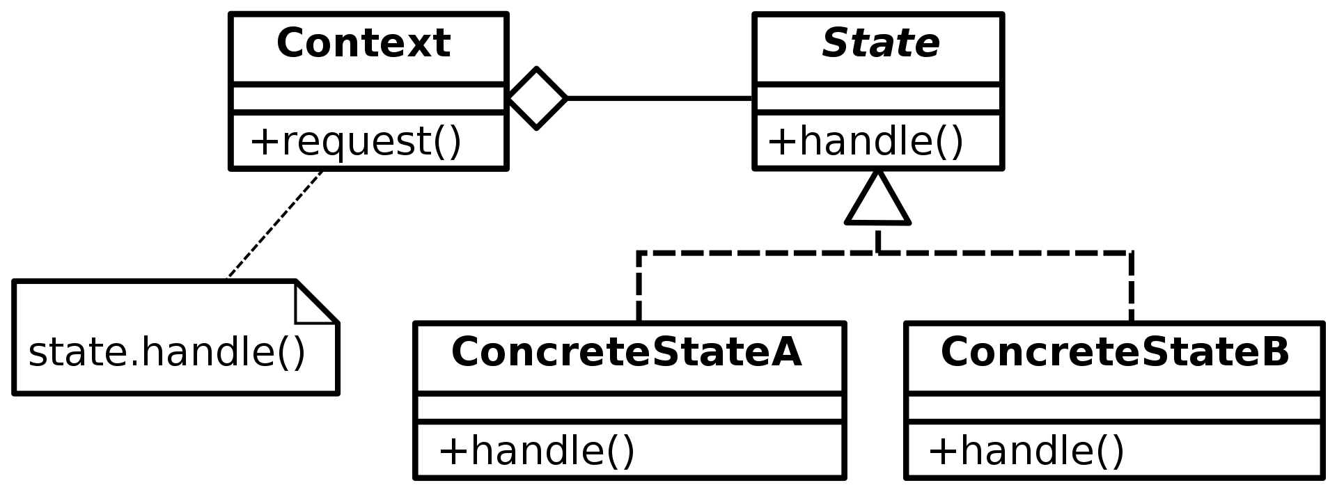 풀어서 설명하면, Context객체에서 state.handle() 실행 시 state 변수에 설정 된 ConcreteState 객체의 handle()이 호출되는데, 해당 메서드에서 필요한 동작을 수행 한 뒤, 따른 ConcreteState로 상태전이가 필요한 경우 handle()내에서 state 변경이 필요하게 됩니다. 이때, ConcreteState에 Context 객체의 참조정보가 할당되어 있다면, 아래처럼 상태변경이 가능하게 됩니다.