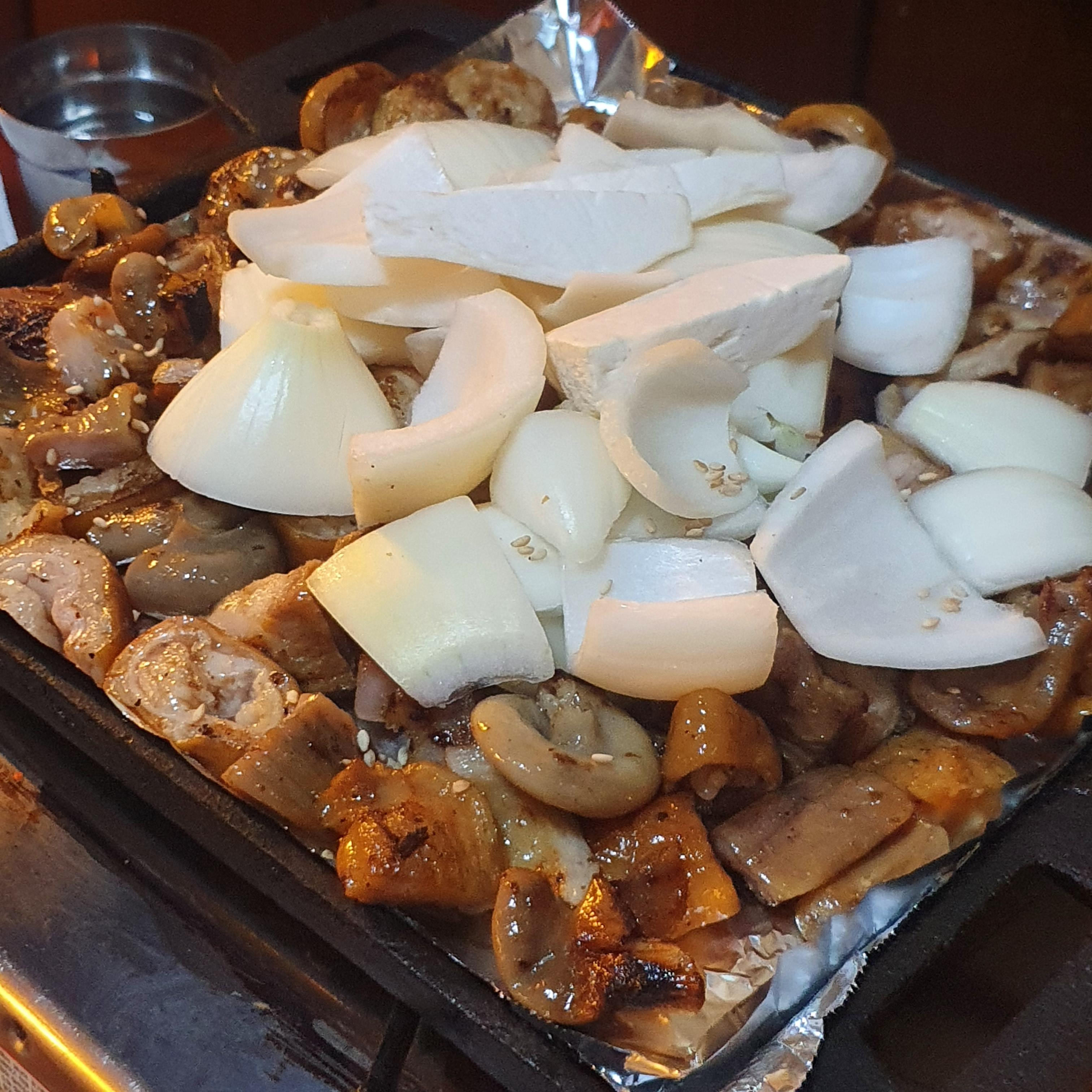 불판 위에 뭐가 너무 많아서 휘적거리면 양파가 자꾸 떨어집니다.
