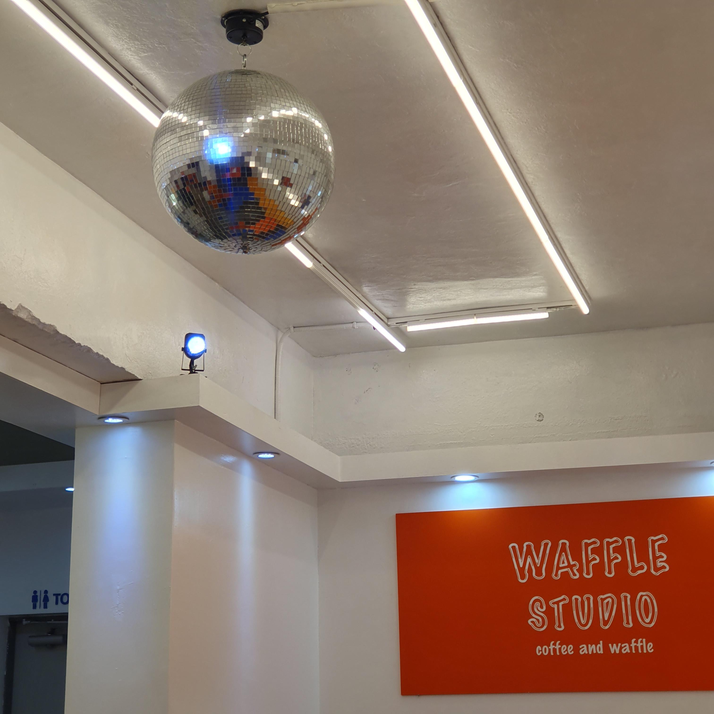 와플 스튜디오에는 미러볼이 하염없이 돌고 있습니다.