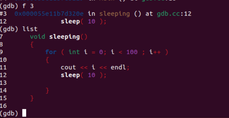 #3 0x000055e11b7d320e in sleeping () at gdb.cc:12