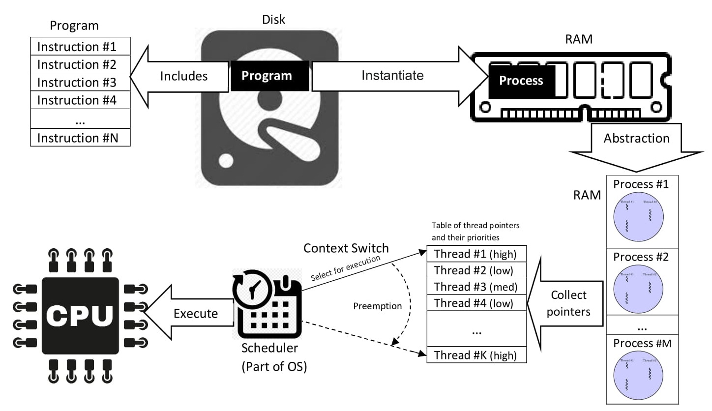 디스크라는 저장소에 저장 된 프로그램이 메모리에 올라와 프로세스가 실행되면 프로세스들은 스레드를 통해 필요한 작업을 수행하게 됩니다. 작업의 최소 단위인 스레드는 운영체제 스케줄러에 의해 자원은 할당받고 실제 명령어(CPU Instruction)를 수행하게 됩니다.