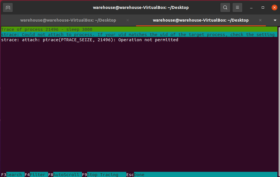 프로세스중 하나를 선택해서 시스템 호출을 추적해 보니 Operation not permitted 라는 메시지를 출력합니다.