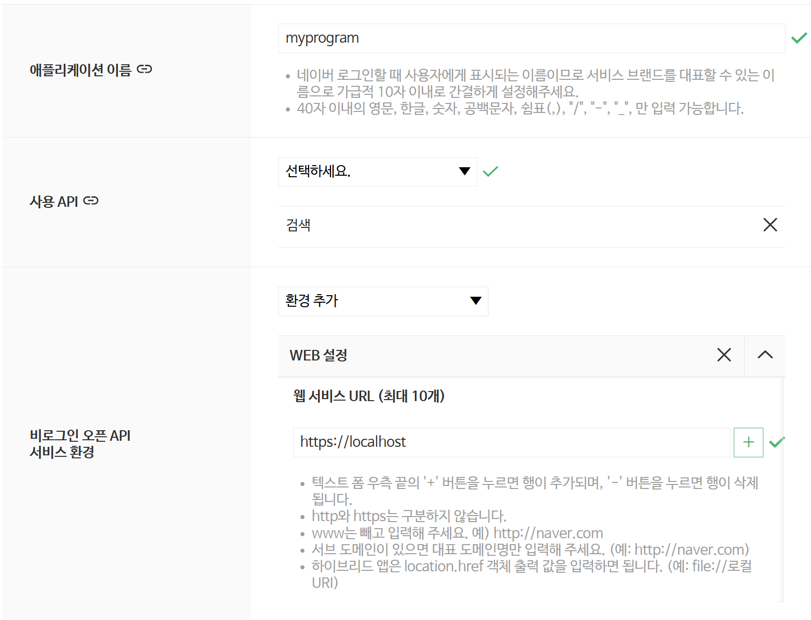 - 웹 서비스 URL: API를 호출할 웹 서비스의 URL을 입력합니다. 실제로 운영하는 웹사이트 주소가 있다면 입력하고, 단순히 개인 학습이나 테스트용이라면 http://localhost 또는 https://naver.com, 본인 블로그 주소 등을 입력해도 무방합니다. 이 URL은 API 호출 시 HTTP 헤더에 포함되어 검증되므로, 유효한 URL을 입력해야 합니다. 저는 아래와 같이 입력을 마무리했어요.
