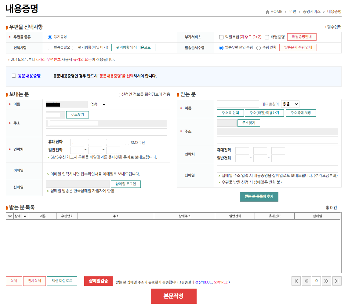 아래 내용증명 화면을 보면 이것저것 입력할 게 많다.