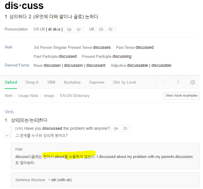 습관적으로 discuss 뒤에 전치사 about을 사용한다. 나 뿐만아니라 다른사람들도 많이 실수할 것 같기는 하다. (착각일지도 모른다.) discuss 뒤에는 곧바로 목적어를 사용하자. 네이버 사전조차 이렇게 알려주는걸 보면 정말 너무너무 많은사람들이 몰라서 아닐까 ?